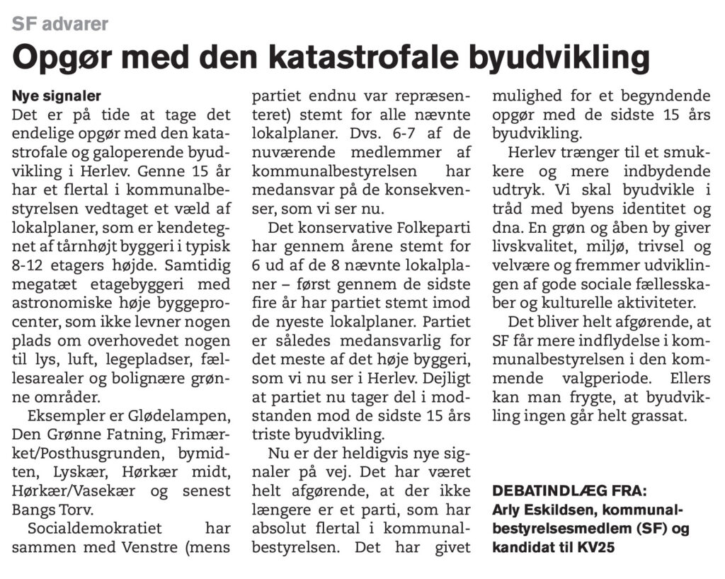 Efter omfattende høringssvar fra borgere og langvarige forhandlinger om en ny kommuneplan for Herlev er resultatet nu en revideret Kommuneplan for Herlev, som betyder et grønnere Herlev, en mere klimavenlig kommune, mere fællesskabsorienterede boligområder, et brud med ti års forfejlet byudvikling, højderne på det fremtidige byggeri begrænses, byggeprocenter sættes ned og planerne om massivt boligbyggeri… Læs mere: Markant nytænkning af byudvikling i Herlev