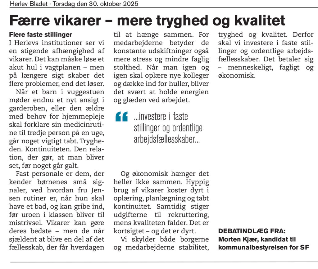 Som far til tre børn i børnehave- og skolealderen ønsker jeg mig først og fremmest, at de små får en tryg og stress-fri hverdag. Med tid og opmærksomhed fra pædagoger og lærere. Det er svært at skabe, hvis der ikke er voksne nok, og her er minimumsnormeringerne vores vigtigste redskab. Uden minimumsnormeringer kan vi få… Læs mere: Herlevs børn fortjener voksne omkring sig – også efter valget